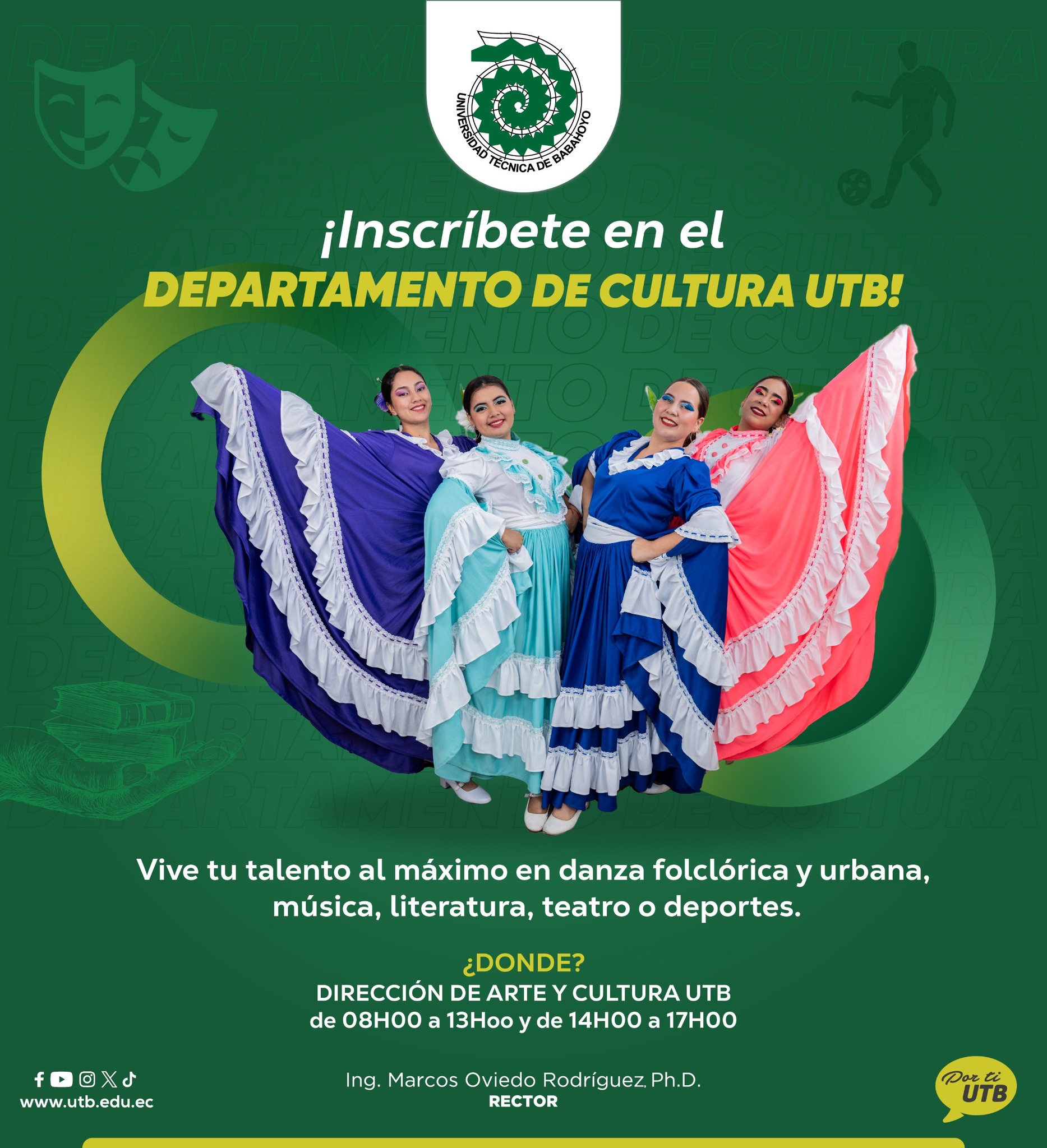 ¡Explota tu talento en la UTB! El Departamento de Cultura te espera con danza folclórica y urbana, música, literatura, teatro y deportes. ¡Inscríbete y vive una experiencia que transforma!