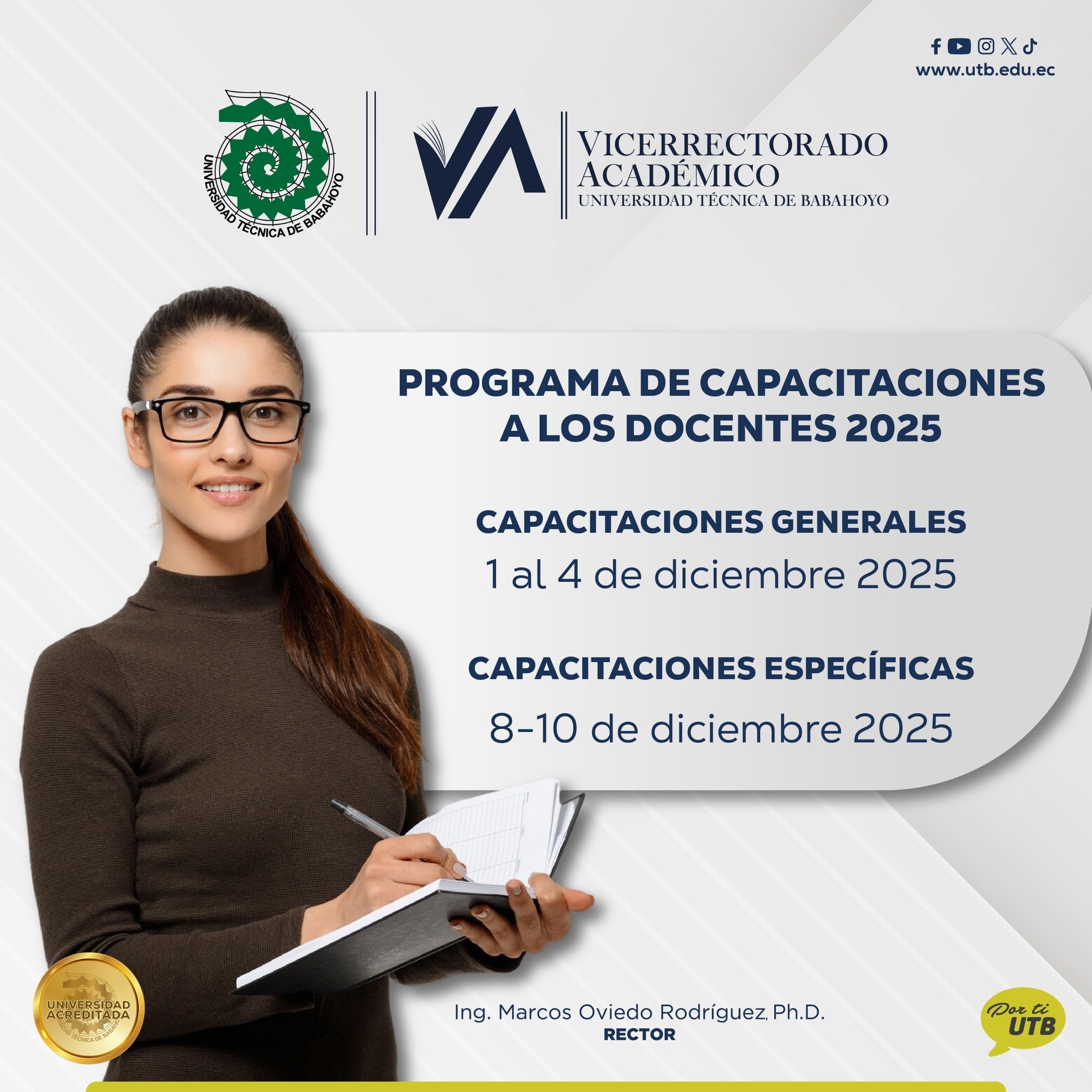 Programa de Capacitación Docente 2025 a ejecutarse del 1 al 4 con Capacitaciones Generales y del 8 al 10 con Capacitaciones Específicas. Una iniciativa orientada a fortalecer las competencias académicas y pedagógicas de nuestros docentes, en cumplimiento de nuestro compromiso con la excelencia educativa y la mejora continua.