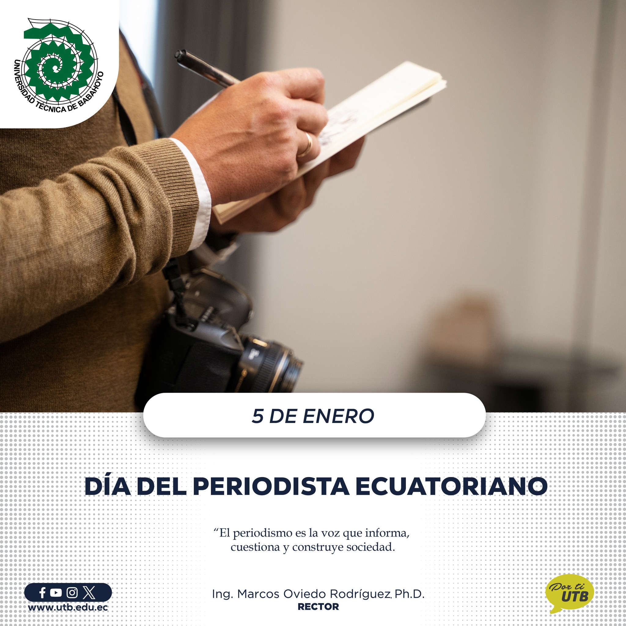 En este día especial reconocemos la labor de las y los periodistas ecuatorianos, profesionales comprometidos con la verdad, la ética y el servicio a la sociedad, su trabajo fortalece la democracia, promueve el pensamiento crítico y contribuye a una ciudadanía mejor informada.
