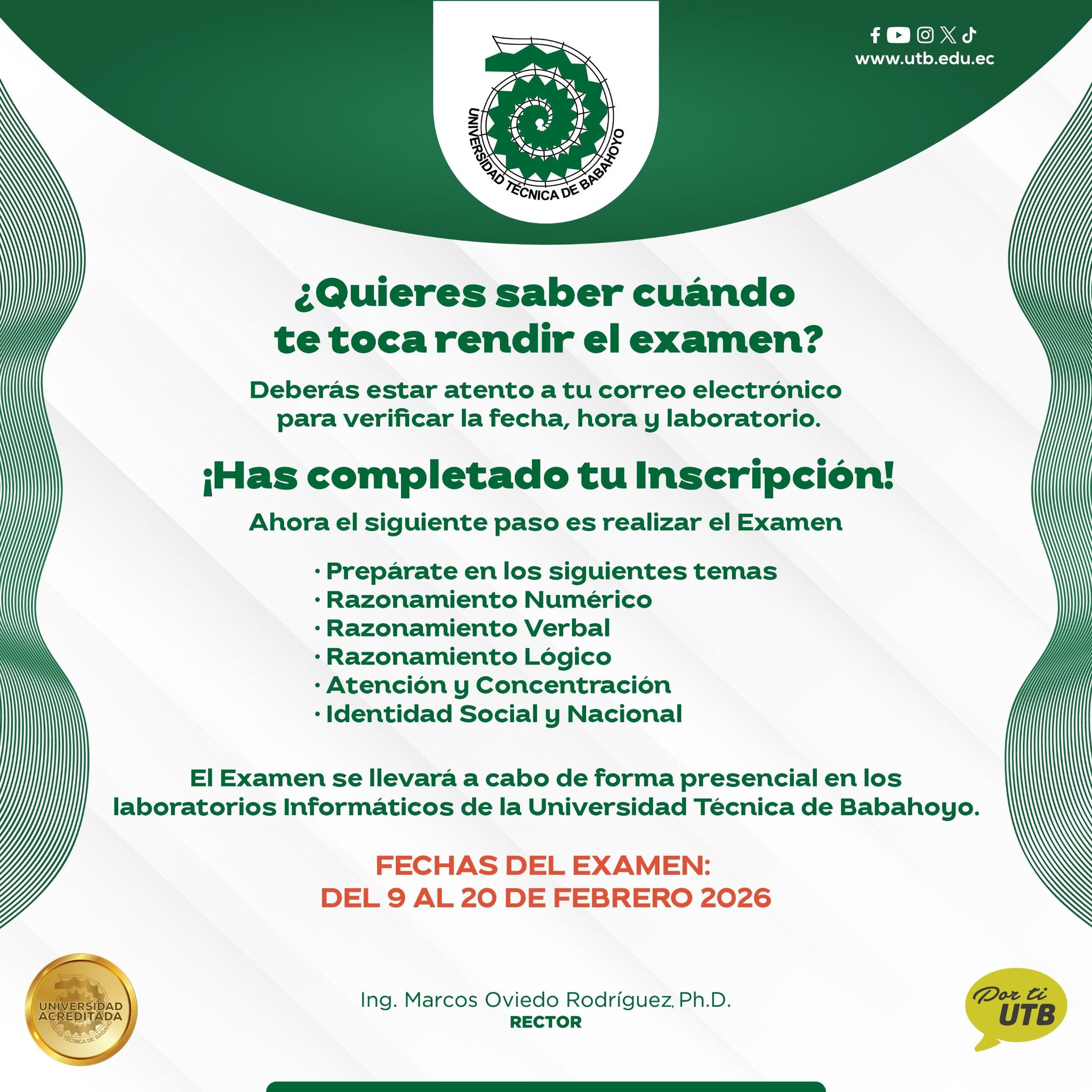El siguiente paso es rendir el Examen de Admisión, que se realizará de manera presencial en los laboratorios informáticos de la Universidad Técnica de Babahoyo, del 9 al 20 de febrero de 2026.