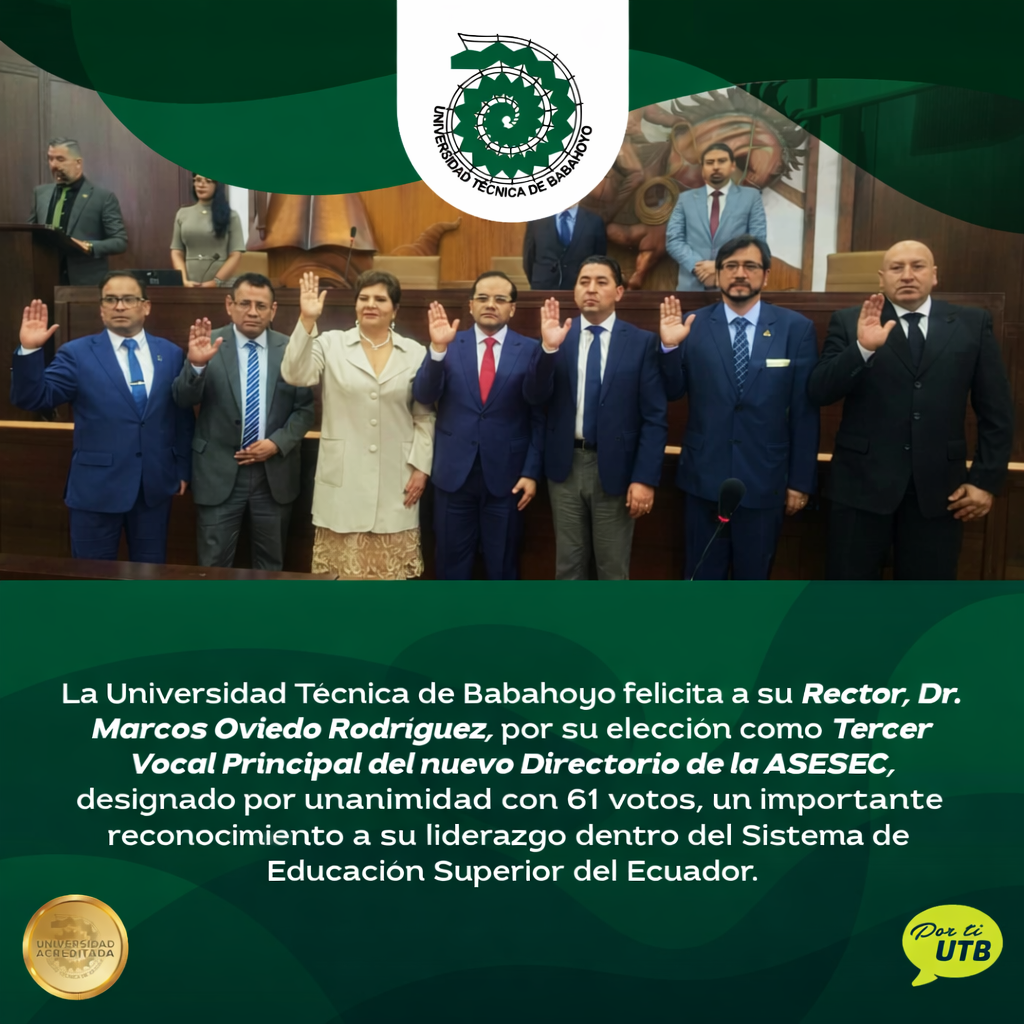 La Universidad Técnica de Babahoyo celebra con orgullo la designación de su Rector, Dr. Marcos Oviedo Rodríguez, como Tercer Vocal Principal del nuevo Directorio de la ASESEC, elección realizada por unanimidad con 61 votos.