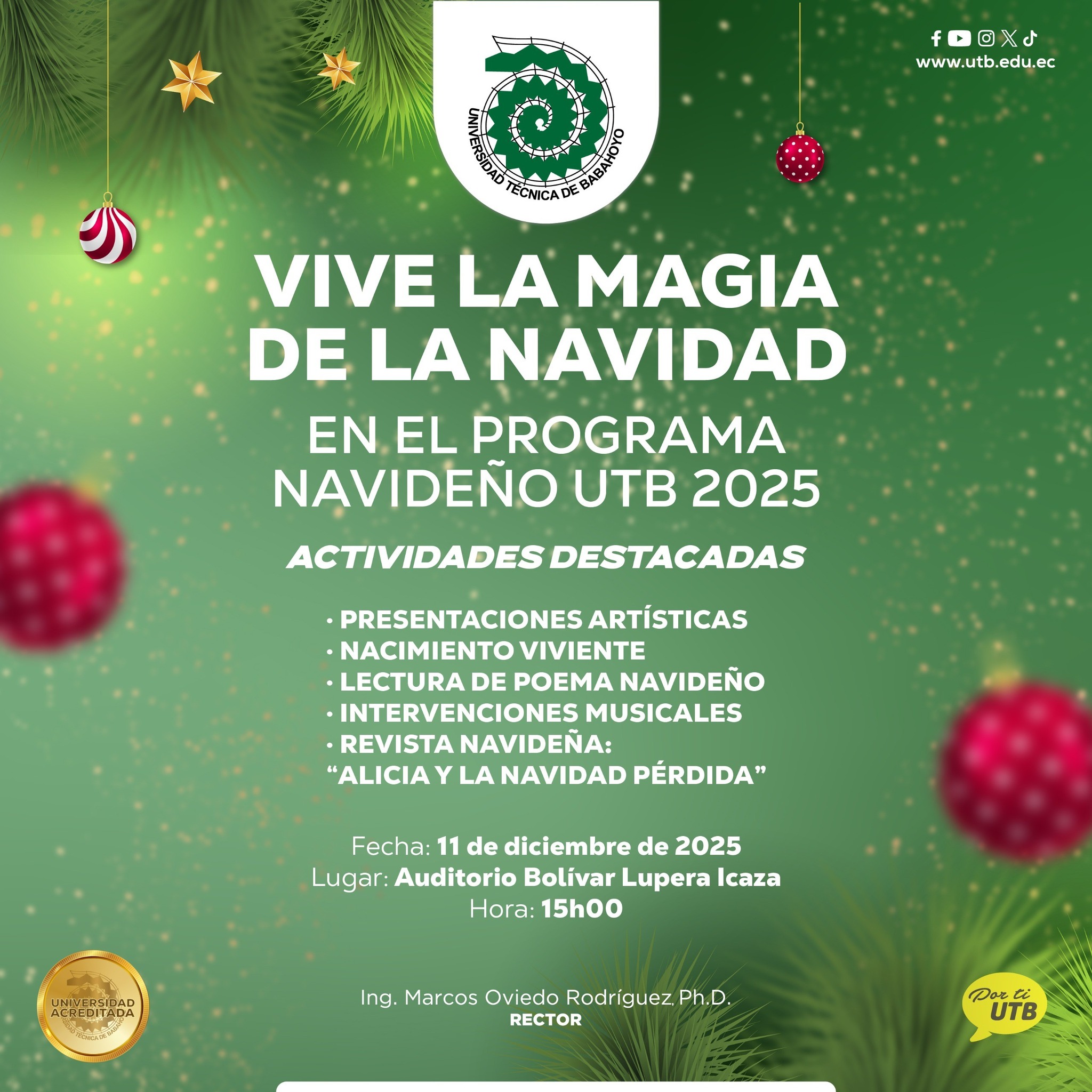 Este 11 de diciembre celebraremos juntos nuestro Programa Navideño UTB 2025, un espacio pensado para compartir en comunidad, disfrutar de expresiones artísticas y reencontrarnos con el espíritu navideño.